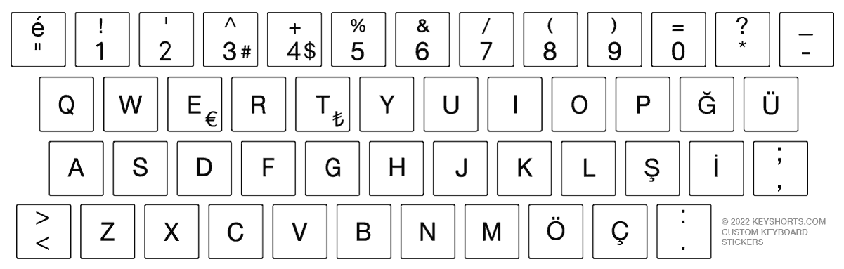 Transparent keyboard stickers with Turkish symbols. Stickers are designed to match "Turkish - QWERTY" keyboard layout on Mac and "Turkish Q" on Windows.