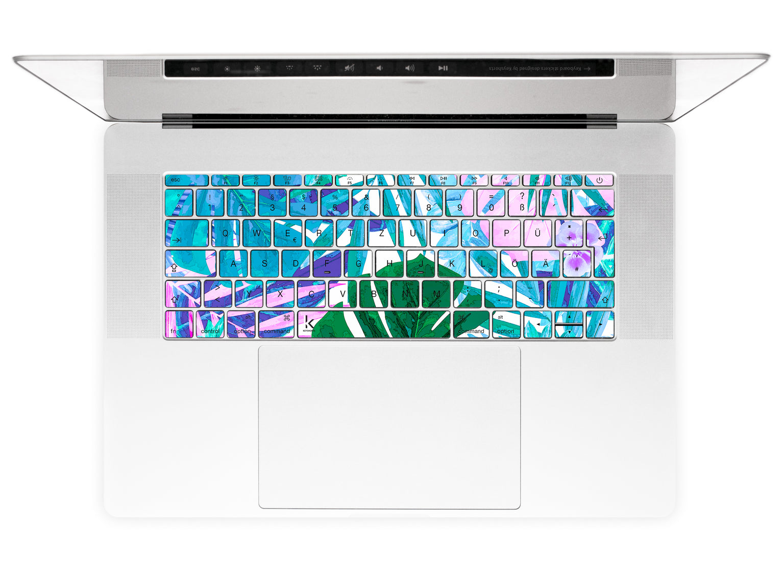 Luxurious MacBook keyboard decal stickers set with watercolor tropical jungle. Made for your MacBook or Apple keyboard to protect and beautify it.